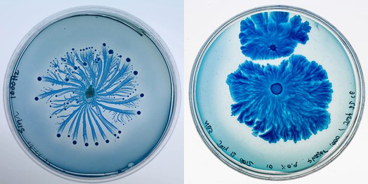 Artists have always been interested in the philosophical debates and technological achievements of the day. Whether working with microbes, semi-living tissue, independent organisms or ecological systems, art practitioners are faced with the challenges of understanding the logic of these new materials, the logic of the bios. At the same time, they are left to grapple with implementing scientific methodology into their own artistic approach. DNA sequencing is increasingly cheap and accessible, which has allowed artists to utilize this method and even modify it for creative purposes. In his work Ocular Revision, Paul Vanouse experiments with new ways of visualizing DNA data[7]. In her bacterial textile works, Anna Dumitriu developed a method of culturing bacteria where living colonies become patterns of a larger fabric. In her bacterial textile works, Anna Dumitriu developed a method of culturing bacteria where living colonies become patterns of a larger fabric[8]. By hacking into the colony’s communication system, Nurit Bar-Shai was able to alter the growth patterns of bacterial colonies to form fractals[9][10].